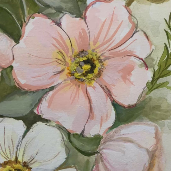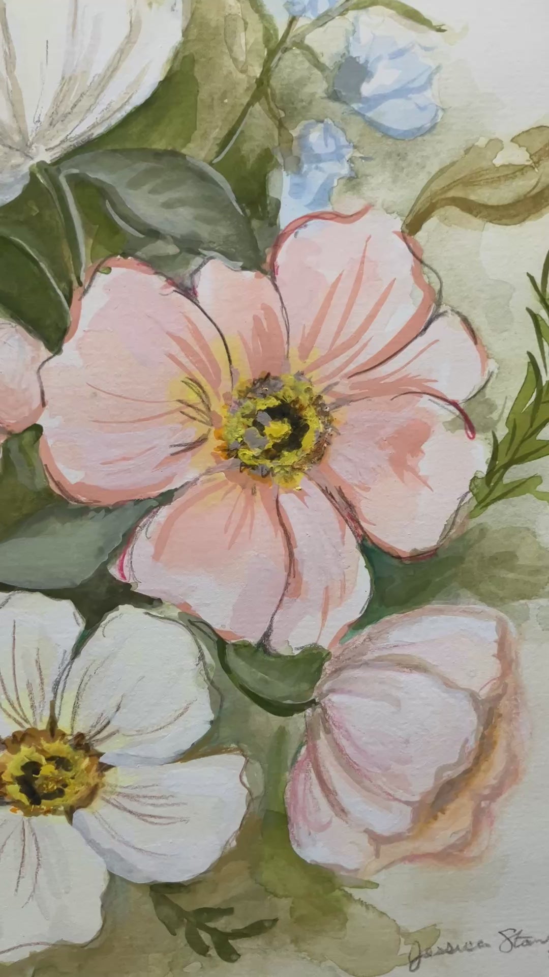 An original floral painting by Jessica Stanish. Gouache, watercolor pencil, charcoal pencil.