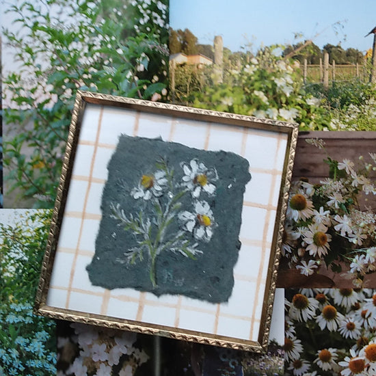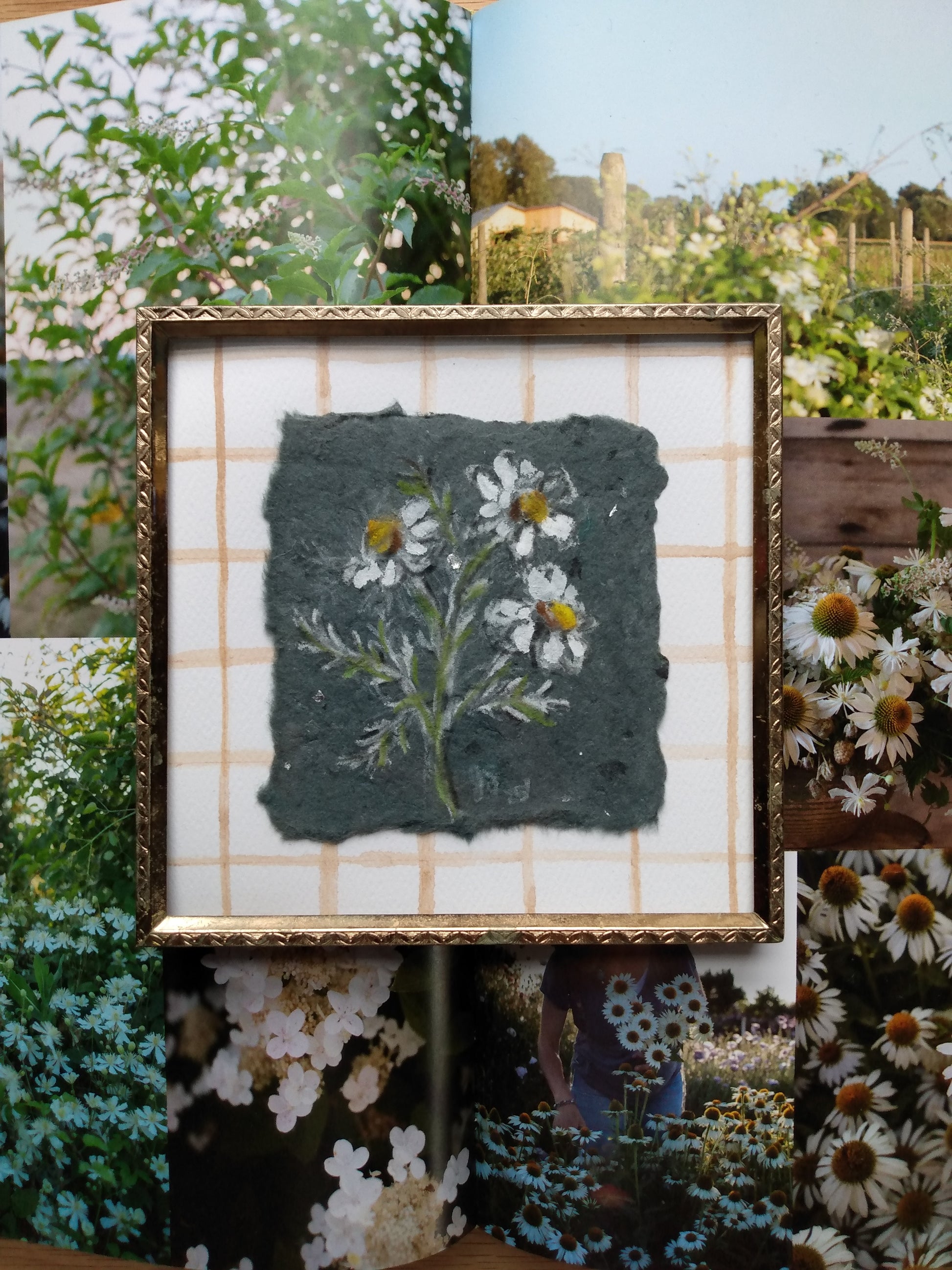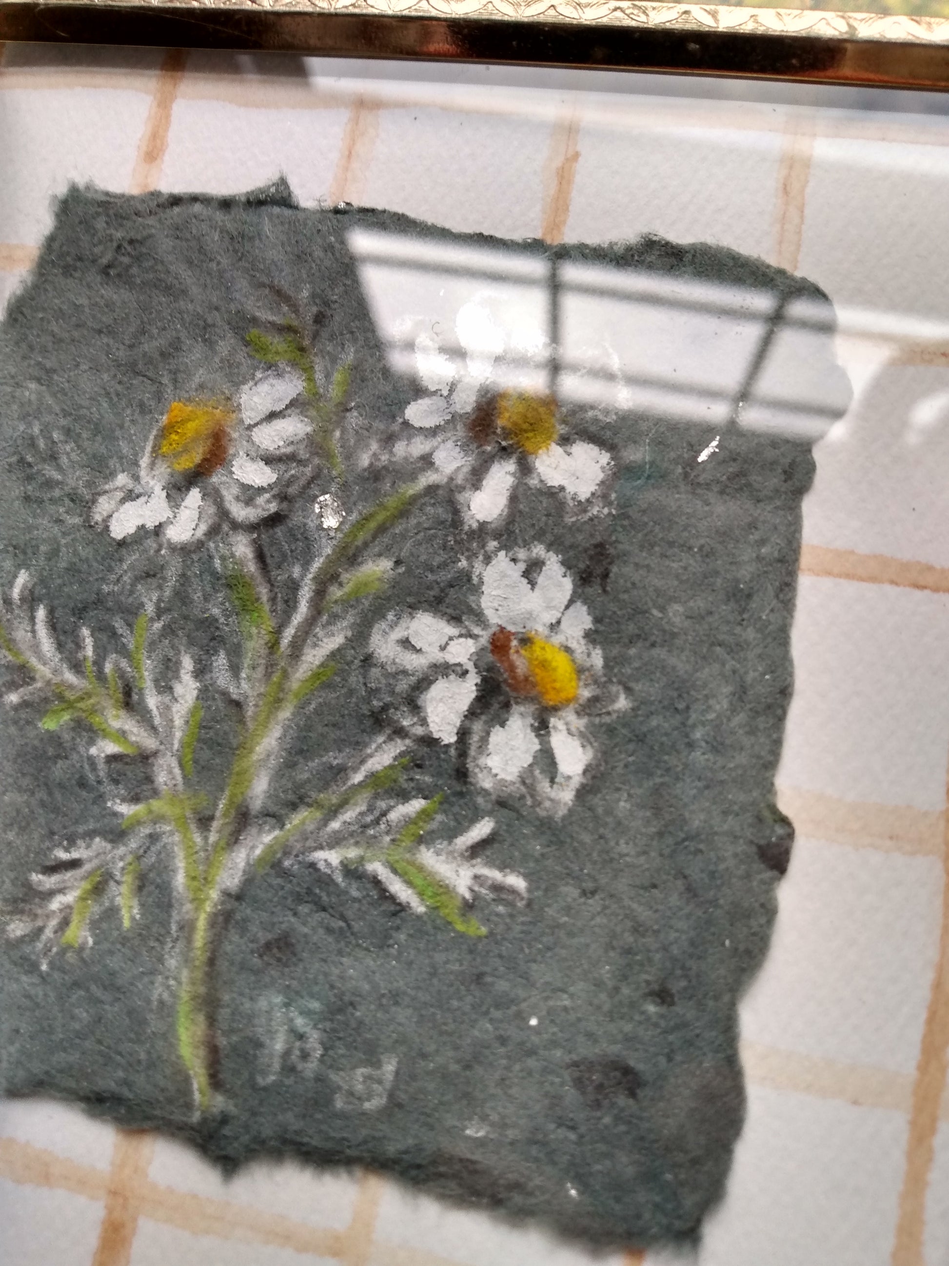 An original miniature painting by Jessica Stanish. Mixed media: gouache, charcoal pencils, soft pastels and wax crayon pastels on handmade paper with gold flecks.