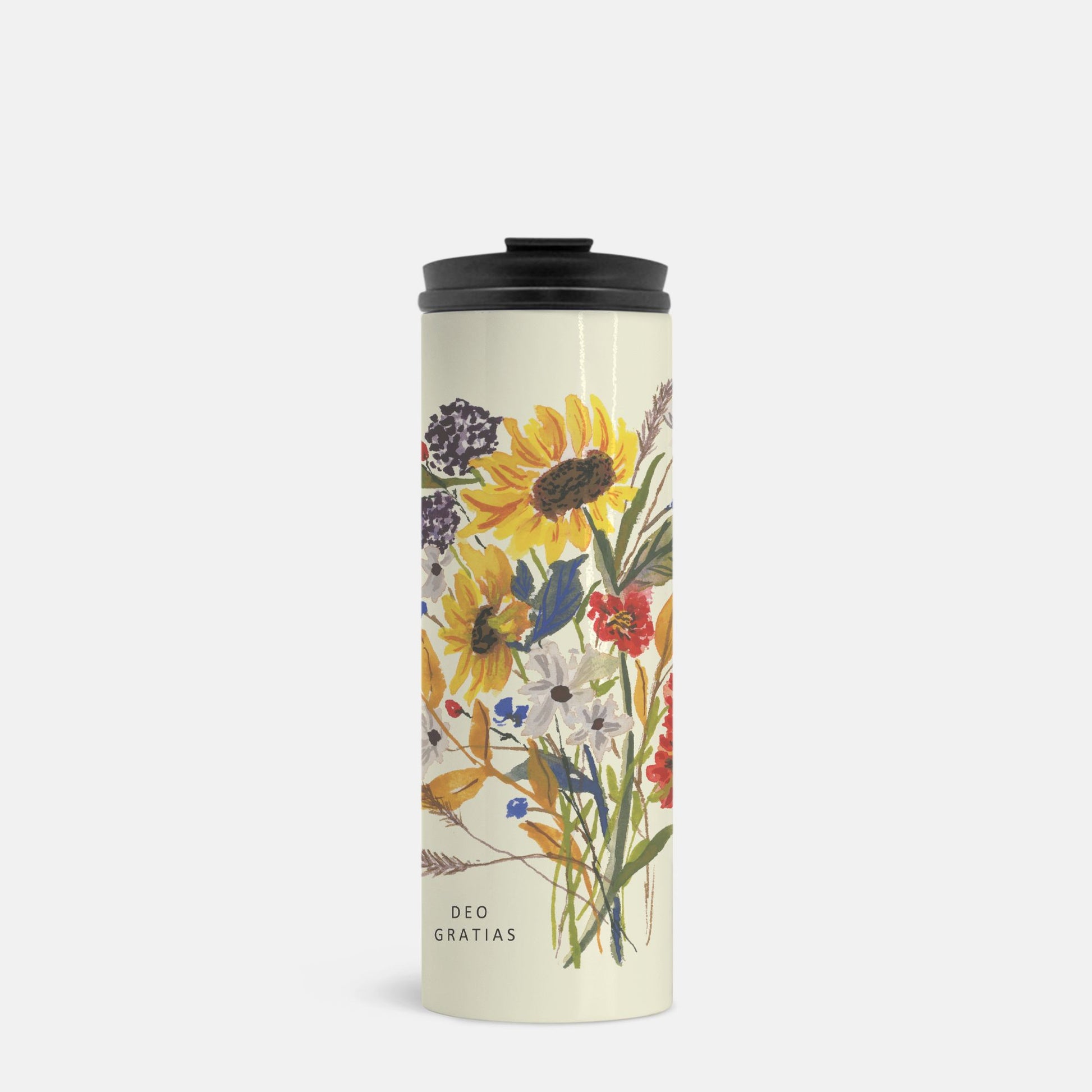Cold or hot beverage? You can have either in this convenient thermal tumbler! Featuring pretty watercolor sunflowers and the text, "Deo Gratias" which means, "Thanks be to God." Fill with cool water for your workout or hot apple cider for your trip to the pumpkin patch.
