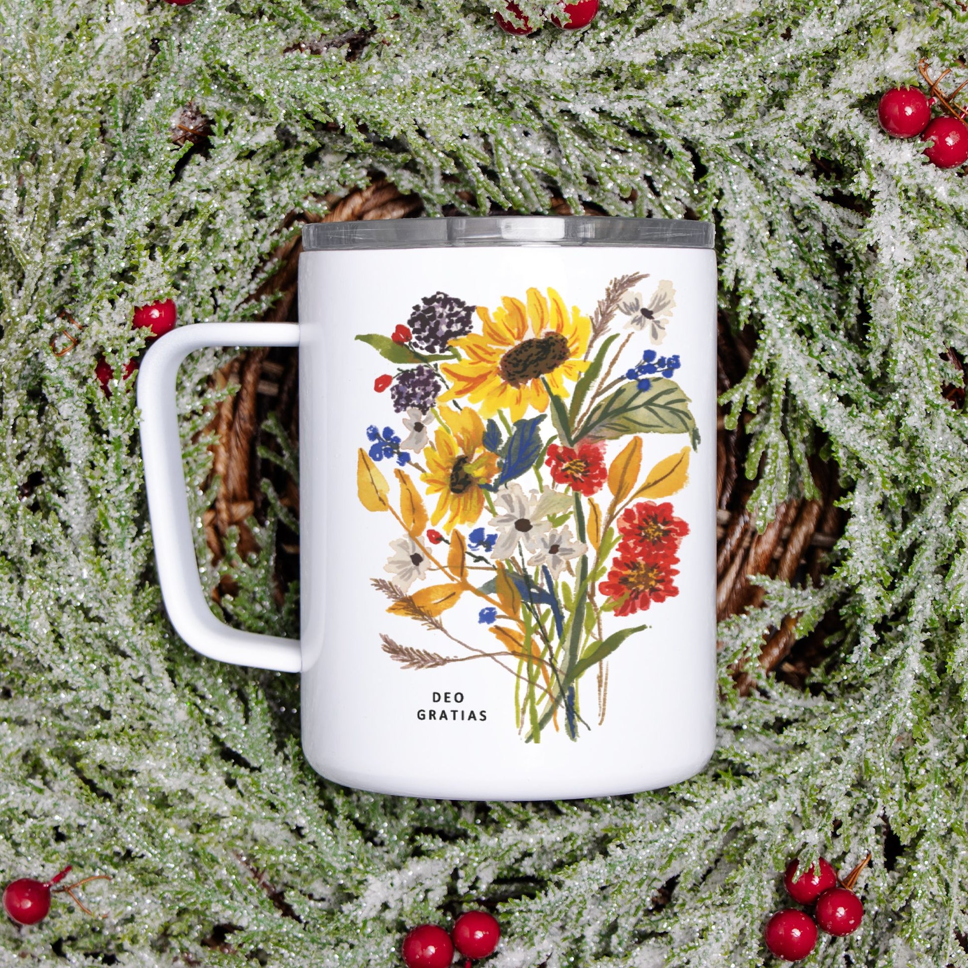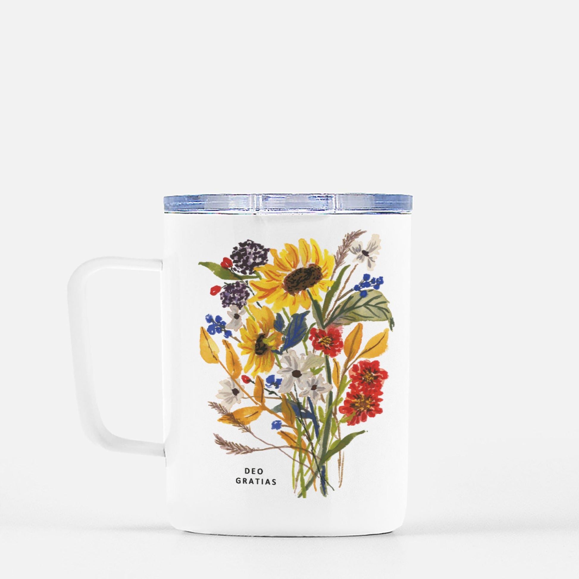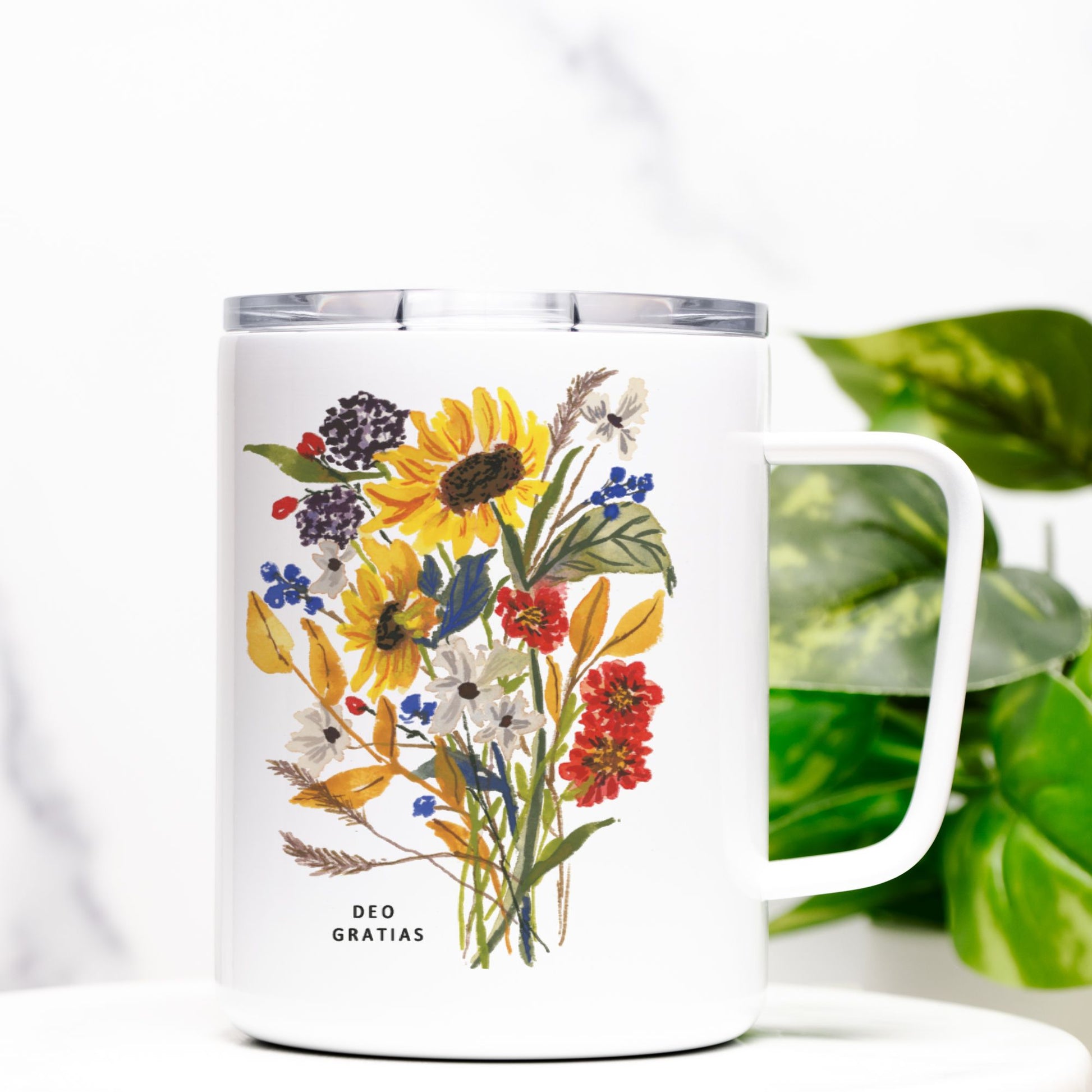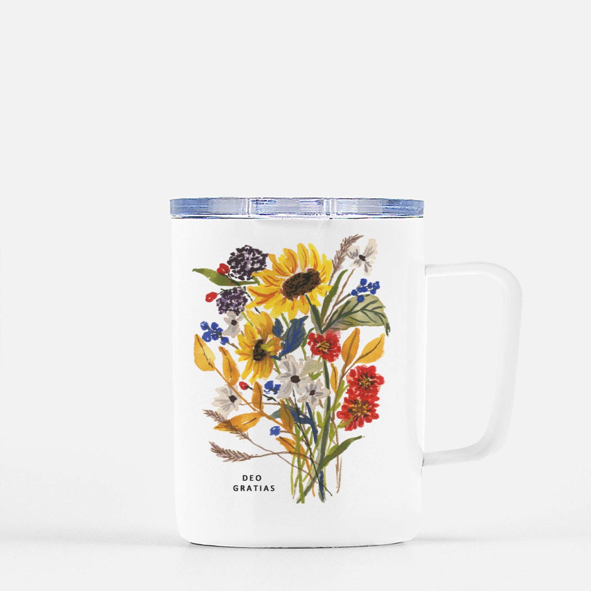 A pretty travel mug with a convenient lid. Easy to hold and convenient to carry from home to office. Keeps beverages warm or chilled. Featuring my original watercolor artwork and the text, "Deo Gratias" which means "Thanks be to God."